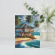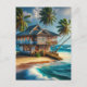 arte de bonito con una gran cabaña de troncos en la playa al estilo de las acuarelas del océano con palmeras soplando en la brisa.