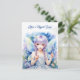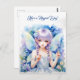 Un hada de bonito con el pelo trenzado de lavanda y alas iridiscentes sostiene una varita de mariposa rodeada de flores y burbujas.