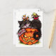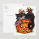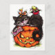 Tarjeta de saludo de Halloween. Gatos negros y arañas