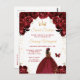 Esta elegante y glamorosa y dulce invitación a los dieciséis años de vida cuenta con una hermosa princesa con piel oscura en un vestido de bata rojo burdeos. El texto combina el guión manuscrito y las fuentes sans serif modernas para un aspecto elegante y sofisticado. Los arreglos florales, mariposa y confitis dorada crean la mezcla perfecta entre rústico y moda. Gráficos de www.etsy.com/uk/shop/SunflowerDayLove