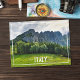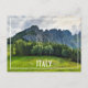 Esta postal presenta una hermosa imagen original de una montaña rocosa con un bosque de pinos en un día de verano nublado en el norte de Italia