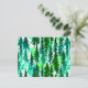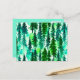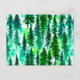 Tarjeta postal con un patrón de acuarela de pinos en un bosque de montaña, en tonos de verde pino medio a oscuro sobre un fondo suave de acuarela