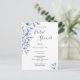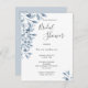Una invitación a la moda para la ducha de novias en azul polvoriento y blanco. Un fondo blanco de moda en la parte delantera. Decorado con estribos botánicos de color azul y follaje. Guión moderno de gran tamaño con letras a mano, tipografía con el texto: Bridal Shower. Plantillas para el nombre de la novia y detalles del fiesta. Texto gris oscuro. Fondo azul polvoriento. Sugerencia: Si no desea que se vea como una postal, haga clic en personalizar, vaya a la parte posterior y quite el separador y el sello postal.