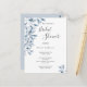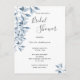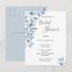 Una invitación a la moda para la ducha de novias en azul polvoriento y blanco. Un fondo blanco de moda en la parte delantera. Decorado con estribos botánicos de color azul y follaje. Guión moderno de gran tamaño con letras a mano, tipografía con el texto: Bridal Shower. Plantillas para el nombre de la novia y detalles del fiesta. Texto gris oscuro. Fondo azul polvoriento. Sugerencia: Si no desea que se vea como una postal, haga clic en personalizar, vaya a la parte posterior y quite el separador y el sello postal.