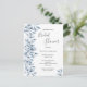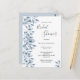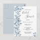 Una invitación a la moda Bridal Shower en blanco y azul plateado. Un fondo blanco de moda en la parte delantera. Decorado con estribos y follaje de color azul plateado botánico. Guión moderno de gran tamaño con letras a mano, tipografía con el texto: Bridal Shower. Plantillas para el nombre de la novia y detalles del fiesta. Texto gris oscuro. Fondo azul plateado. Sugerencia: Si no desea que se vea como una postal, haga clic en personalizar, vaya a la parte posterior y quite el separador y el sello postal.