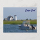 Una imagen pintoresca de Cape Cod, esta foto muestra un barco amarrado a motor y un faro a la luz del sol en Stage Harbor, Chatham, Massachusetts