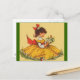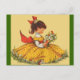 Adorable ilustracion vintage de un chica de pelo marrón sentado mirando un ramo de marrones blancos que ella sostiene. Colores dorados salpicados de rojo y verde.