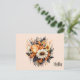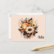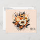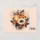 Postal con un elegante ramo de flores de estilo gótico. Compuesto por tulipanes naranjas, margaritas amarillas, hojas y brotes grises y algunos acentos de berry naranja.