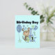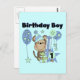 Un mono de niño rodeado de estrellas, globos, regalos de cumpleaños y texto que dice "Nacimiento de niño 1" en camisetas de primer cumpleaños, pantalones de vestir, bolsas de té, pegatinas, tarjetas y más.