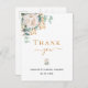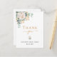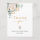 Una moderna y elegante ducha de novia con tarjeta de agradecimiento. Un fondo blanco moda. Decorada con flores blancas, flores (peones) y hojas de eucalipto de color verde acuático, estribos, vegetación y una falsa primavera dorada. Letras negras y doradas. Al frente del texto: Gracias, nombre y fecha. Parte posterior: plantilla para su nota de agradecimiento y nombre.