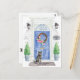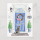 Anuncie su nueva dirección con nuestra elegante invitación con un gato británico de estilo Shorthair, una puerta delantera azul, una estera de bienvenida, un signo de pizarra, topiarios y una corona floral sobre un fondo de ladrillo gris.