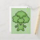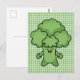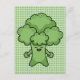 Brócoli de dibujos animados verde lindo con una cara feliz adorable. El fondo es un patrón de gingham verde y blanco.