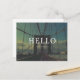Un elegante diseño de postal con vistas al icónico puente de Brooklyn bajo un cielo sereno. La imagen capta los cables y la estructura de suspensión del puente con un filtro de inspiración vintage, lo que le da un ambiente cálido y nostálgico. El texto en negrita y blanco "HOLA" se centra de manera prominente, con el subtítulo "DESDE BROOKLYN" debajo, creando un contraste tipográfico limpio y elegante.
