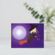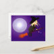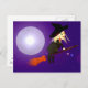 Postal con mi obra de arte original de una bruja linda hablando en su celular mientras monta en su escoba pasando una luna llena.