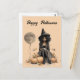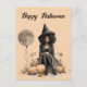 Una bonito, una joven bruja con un vestido negro y un gorra se sienta entre calabazas naranjas con un globo lunar lleno flotando a su lado esperando Halloween.