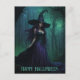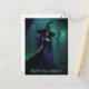 Envíe sonrisas espeluznantes con esta fantástica tarjeta de saludo de Halloween, que presenta una pintura digital de una bruja encantada en morado y negro, en el fondo un misterioso bosque de niebla verde. La parte delantera de la tarjeta muestra las obras con el mensaje festivo "Feliz Halloween". En la parte trasera hay un saludo de personalizable o un deseo de Halloween. Es una manera encantadora de compartir el espíritu de Halloween. Perfecto para los amantes de las brujas, diversión con trucos o trucos, decoración de temporada, y para los amantes de la fantasía gótica encantadora.