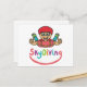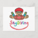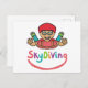 Un divertido diseño de Skydiving muestra un paracaidista con casco, gafas, pulgares hacia arriba y piernas mostradas detrás. Cayendo por el aire esperando el momento adecuado para desplegar el paracaídas. La palabra "Skydiving" debajo con la "g" convirtiéndose en una gran sonrisa.