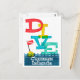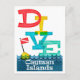 Colorido diseño de la escoria caribeña de las Islas Caimán. Tipografía retro al estilo de inkpress con la palabra "buceo", junto con una bandera scuba flotando en el océano.