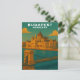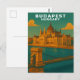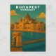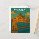 Capture the majestic spirit of the 'Pearl of the Danube' with this elegant Budapest, Hungary Travel Card. This vintage-style illustration features a grand, many-spired palace bathed in golden light, standing proudly along the riverbank.