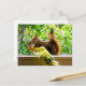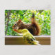 Una postal con la foto de un pájaro cigalo amarillo encaramado en la ventana viendo cómo una ardilla roja se hunde.