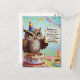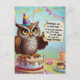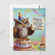 Postal Búho con sombrero de cumpleaños parado en pastel