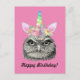 Si tienes un amigo o familiar a quien le guste lo inusual, o incluso podría ser gruñón o extravagante, esta tarjeta postal de Feliz Cumpleaños podría ser la elección correcta. Cuenta con un búho vintage africano Woodford, circa 1900, con un divertido cuerno de unicornio con flores más pestañas postizas largas. La mezcla de la mirada de búho con el cuerno pastel arcoíris frívolo y las flores podría hacer sonreír al destinatario. El fondo de esta tarjeta postal de "buhlicornio" es rosa caliente.