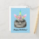 Si tienes un amigo o familiar a quien le guste lo inusual, o incluso podría ser gruñón o extravagante, esta tarjeta de cumpleaños podría ser la elección correcta. Cuenta con un búho vintage africano Woodford, circa 1900, con un divertido cuerno de unicornio con flores y pestañas postizas largas. La mezcla de la mirada de búho con el cuerno pastel arcoíris frívolo y las flores podría hacer sonreír al destinatario. El fondo de esta tarjeta "búholicornio" es azul claro.