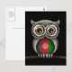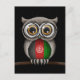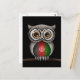 Este adorable diseño cuenta con un pequeño búho con la bandera de Afganistán en el pecho del ave. Las gafas de ojos se sientan en la nariz de la lechuza, lo que le da al patrón un toque lúdico y sabio. El búho está sentado en una pequeña rama con una noche llena de estrellas que se ve al fondo. La cabeza de gran tamaño y el cuerpo pequeño, junto con los detalles de las plumas, crean una hermosa combinación de un aspecto personalizado y realista. Este singular diseño patriótico de búhos afganos es un lindo ejemplo de esta sabia y maravillosa criatura nocturna.