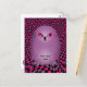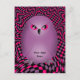 Búho de punk en morado sobre un fondo de tablero de ajedrez agitado en morado, rosa caliente y negro sobre una linda postal.