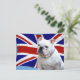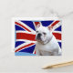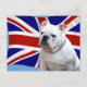 Se muestra una imagen fotográfica de un bulldog inglés blanco frente a una bandera británica.