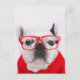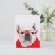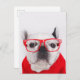 Bulldog francés con gafas de visión y camisa roja, fondo blanco.