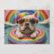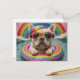 Un diseño de color arcoiris exhibe un Bulldog francés que disfruta de una excursión a la carroza en una colorida carroza con un arco iris en el fondo