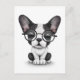 Postal Bulldog francés lindo cachorro con gafas, blanco