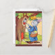 Ilustracion vintage de un conejito que entrega el correo a una conejita en una casa arbolada. Colorido y divertido.