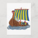 Las velas azules y amarillas vuelan sobre este barco de avioneta. Los escudos adornan el costado. El monstruo del mar sirve al timón.
