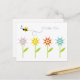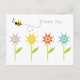 A Gracias postal con una deliciosa ráfaga de color con flores de margarita roja, azul, violeta y amarilla. Un abejorro alegre está zumbando encima con las palabras - ¡Gracias! - una manera perfecta de expresar aprecio. Ilustracion original de Mango Moon Studio.