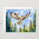 pintura acuática dinámica de un zumbido que se eleva sobre un denso bosque de pinos, mostrando el majestuoso vuelo de este pájaro de presa en un entorno natural. Perfecto para los amantes de la fauna y la naturaleza.