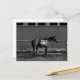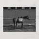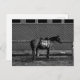Imagen en blanco y negro de un caballo ensillado al lado del poste y pared estable como fondo.
