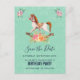 Tarjeta postal de save the date de fiesta con una imagen encantadora y caprichosa de un caballo de balancín antiguo con un ramo floral elegante en rosa y amarillo. El fondo es un patrón de damasco desgastado verde claro.