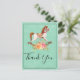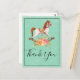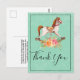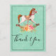 Tarjeta de agradecimiento con una imagen encantadora y caprichosa de un caballo de balanço antiguo con un ramo floral elegante en rosa y amarillo. El fondo es un patrón de damasco desgastado verde claro. Mensaje personalizado en el reverso.