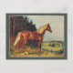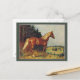 Pintura de aceite de color vintage de un caballo de color castaño con cola de flaxo y mané sobre una colina con un bosque de pinos y vistas a una granja y al paisaje de campos. Envuelto en un delgado marco plateado de dos tonos y gris de buque de guerra ancho.