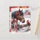 Postal de Navidades con temática agrícola personalizada con un caballo marrón bonito con un arco rojo y un cardenal rojo bonito en la valla con un granero rústico en el fondo de un arte acuático de invierno nevado.