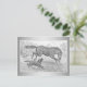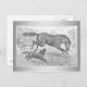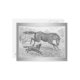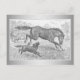 Encantador ilustracion blanco y negro vintage de un perro negro persiguiendo a un caballo. El caballo está galopando y hay una casa de campo y una vaca en el fondo. Se coloca en un marco gris plateado de dos tonos.