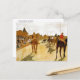 Postal de arte fino, con caballos de carreras antes de los Stands (El desfile) (1872), de Edgar Degas (1834-1917). Un cuadro de jinetes desfilando antes de las carreras. Degas era un artista impresionista francés, notado por su representación de bailarinas. También hizo varios pasteles de caballos y jinetes.