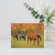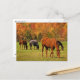 Esta postal presenta una fotografía artística de un hermoso paisaje rural de otoño con caballos pastoreando el césped verde. Detrás de ellos se alza una colina con gloriosos colores otoñales de rojo, naranja, oro, amarillo, marrón y verde.
