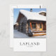 Postal de la foto de una cabaña de madera de madera nevada tradicional en Laponia en el norte de Finlandia sobre el Círculo Polar Ártico con una caja blanca con el texto "Laponia, Finlandia".