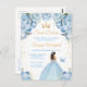 Esta elegante y glamurosa invitación de cumpleaños para sweet sixteen presenta a una hermosa princesa con cabello castaño en un vestido de baile azul claro. El texto combina letra manuscrita y fuentes modernas sans serif para un aspecto clásico y sofisticado. Los arreglos florales, la mariposa y el confeti dorado crean la mezcla perfecta de rústico y chic.