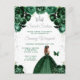 Esta elegante y glamurosa invitación de cumpleaños de sweet sixteen presenta a una hermosa princesa con cabello castaño en un vestido de gala verde oscuro. El texto combina letra manuscrita y fuentes modernas sans serif para un aspecto clásico y sofisticado. Los arreglos florales, la mariposa y el confeti plateado crean la mezcla perfecta de rústico y chic.