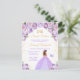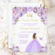 Esta elegante y glamurosa invitación de cumpleaños de sweet sixteen presenta a una bella princesa con cabello castaño en un vestido de baile de color morado claro. El texto combina letra manuscrita y fuentes modernas sans serif para un aspecto clásico y sofisticado. Los arreglos florales, la mariposa y el confeti dorado crean la mezcla perfecta de rústico y chic.