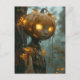 La imagen representa un ilustracion asombrosamente hermoso de una figura con una calabaza para la cabeza. La calabaza es muy detallada, con ojos brillantes que emiten una luz cálida y dorada. Delicadas hebras de viñas y alambres se entrelazan alrededor de la calabaza y el cuello de la figura, lo que añade un efecto espeluznante pero encantador. La figura está vestida con un atuendo de color tierra y desgastado que se mezcla perfectamente con el ambiente otoñal. El fondo cuenta con un bosque nublado con luces suavemente brillantes y hojas caídas, lo que crea una atmósfera misteriosa y mágica.
